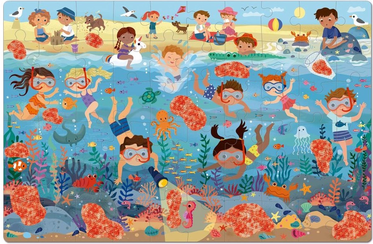 Ontdek de "Zee/Oceaan" puzzel met 60 stukjes (52 x 34 cm) en een magische bril om verborgen elementen te zien! Kinderen genieten van het leggen van de puzzel en het zoeken naar verborgen details in de rood gearceerde gebieden. Inclusief poster op ware grootte. Stevige, kindvriendelijke stukjes van 2 mm dik karton. Puzzels bevorderen concentratie, geheugen, fijne motoriek en probleemoplossend vermogen.